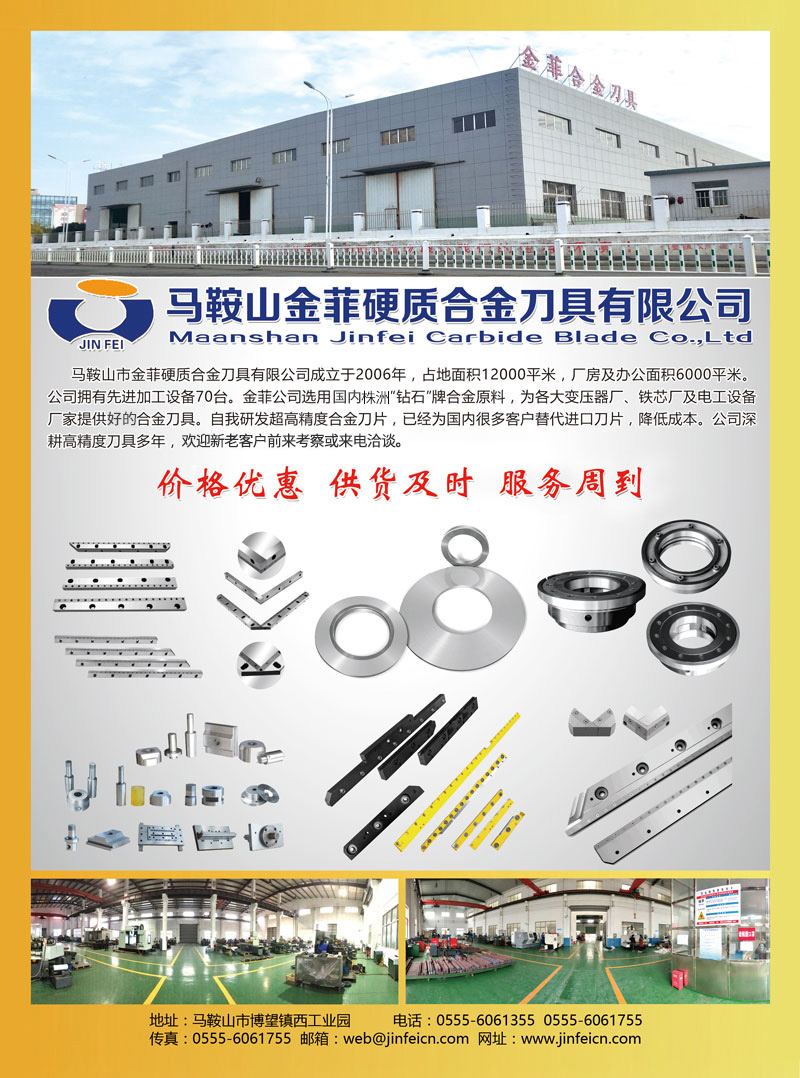 馬鞍山市金菲硬質(zhì)合金刀具有限公司成立于2006年,占地面積12000平米,廠房及辦公面積6000平米。公司擁有加工設(shè)備70臺(tái)。金菲公司選用國(guó)內(nèi)有名'鉆石"牌合金原料,為各大變壓器廠、鐵芯廠及電工設(shè)備廠家提供合金刀具。自我研發(fā)超高精度合金刀片,已經(jīng)為國(guó)內(nèi)很多客戶替代進(jìn)口刀片,降低成本。公司深耕高精度刀具多年,歡迎新老客戶前來考察或來電洽談。